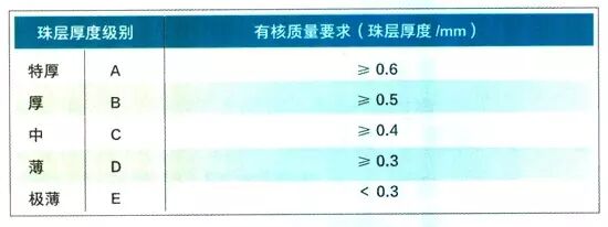 对有核珍珠而言,还需评价珠层厚度级别。珠层厚度是从珠核外层到珍珠表面的垂直距离,可划分为特厚、厚、中、薄、极薄5个级别(详见下表)。